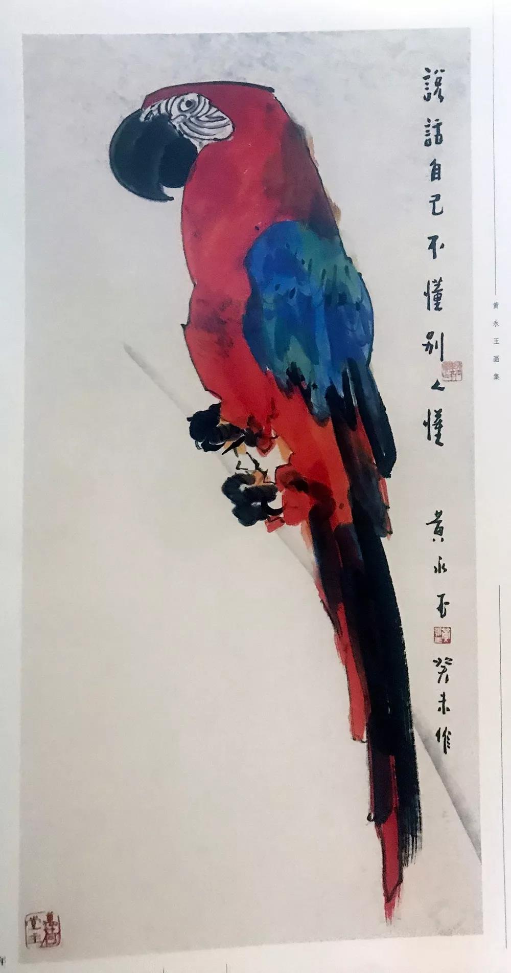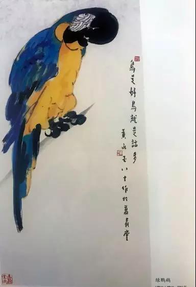 比如黃老畫(huà)過(guò)一只鸚鵡,精神的很,結(jié)果配字:鳥(niǎo)是好鳥(niǎo),就是話多。