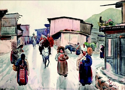 拉卜楞街市圖頁(yè)(水彩) 韓樂(lè)然作