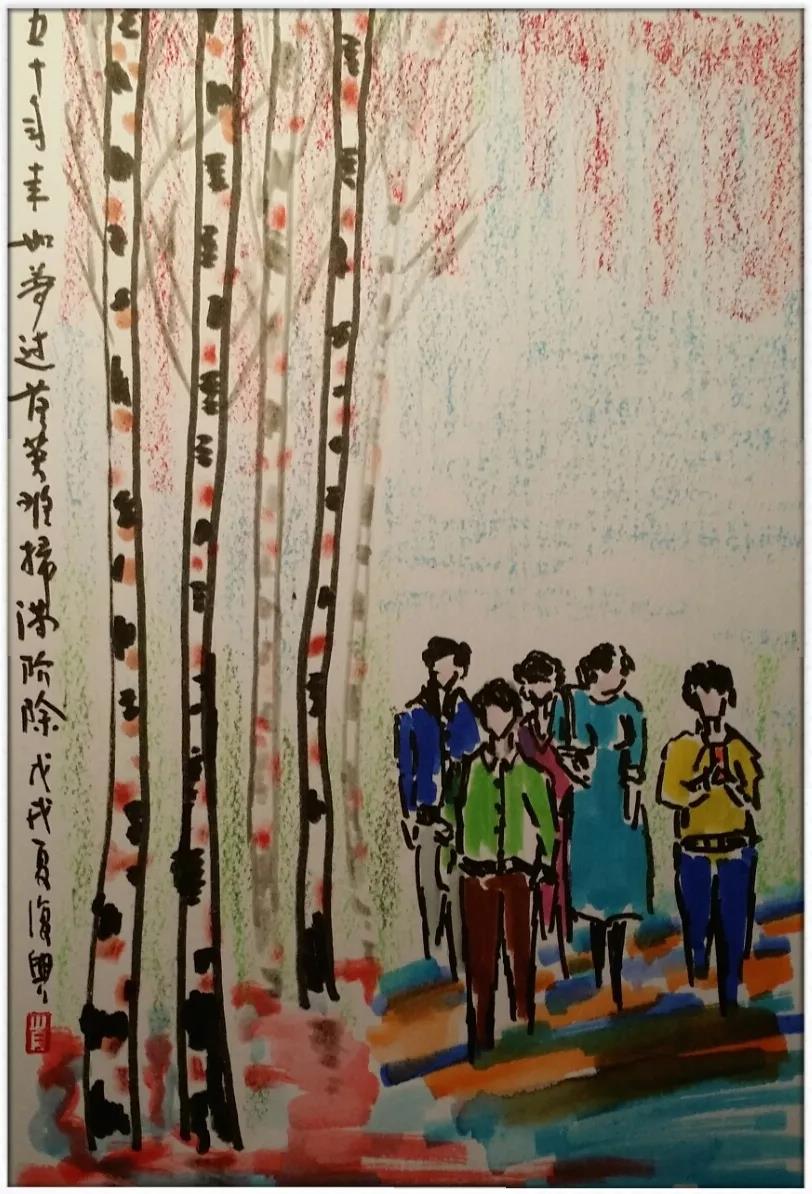 想起李賀年輕的詩句:幾度青春老,千年白日長。不禁感喟。五十年過后的今天,雖然有日子的重合,卻難以有青春的重現(xiàn),落下的葉子,不會(huì)如鳥一樣,重新飛上枝頭。兩鬢蒼蒼的我們,可以在觥籌交錯(cuò)的聚會(huì)中、在發(fā)黃的老照片的展覽中,在花枝招展的歌舞晚會(huì)中,無盡懷舊,緬懷青春。青春如花,盡管也曾經(jīng)開放過,卻是一朵謊花。