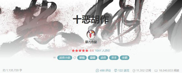 倘若對豆瓣閱讀這個寫作平臺有所了解,都知道它的風格是文藝和清新的,與其它以超長篇連載為特點的網絡文學平臺比起來,豆瓣閱讀上的作品,以幾萬字的中篇作品為主,并且對文學性的追求較高,可能是所有網絡文學平臺當中,與傳統文學最貼近的。在這樣一個小清新的發(fā)表平臺上,有一部叫做《十惡胡作》的長篇連載武俠小說異軍突起,在豆瓣閱讀上連載近兩年來,點擊量已過千萬,成了平臺上點擊量與評分最高的連載作品。