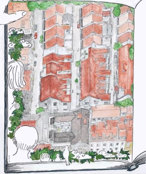 整片城市老街景,被鑲嵌在書中,那些上海的紅色屋頂是童話的顏色。爺叔想表達什么?左側翻書的大手和男女后腦勺都沒上色啊,下方小鳥尾巴怎么伸出了畫面,他解釋說,“這是夢中的效果”。