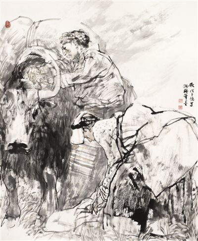 幾十年如一日的外出寫生,讓我對如何用筆墨去反映生活感受也有點(diǎn)滴體會。中國幅員遼闊,風(fēng)光各異,藝術(shù)感覺也隨之變化。我長期生活在北方,每年都會深入北方農(nóng)村生活一段時間。改革開放初期,在浙江美術(shù)學(xué)院學(xué)習(xí)時,我得以有機(jī)會去云南瑞麗傣族地區(qū)深入生活。我感到用表現(xiàn)河北農(nóng)民慣用的以墨為主的方法,表現(xiàn)不出自己在云南感受到的形象,一開始畫出的肖像畫,總不是那種“味兒”。經(jīng)過一段時間摸索,我開始注意墨與色的關(guān)系,想到應(yīng)用水分的方法,去描繪人物特有的外在特征和內(nèi)心世界,最終畫出了滿意之作。后來,我又去青海藏族地區(qū)深入生活,那里的人和物與在南方見到的又完全不同,如果用表現(xiàn)云南傣族所慣用的筆墨去表現(xiàn)藏族人民,肯定又是行不通的,進(jìn)而我又探索出一套嶄新的筆墨語言:以凝重的線為主、色彩為輔,吸收山水畫皴法等技法,深入刻畫藏族人民的性格。