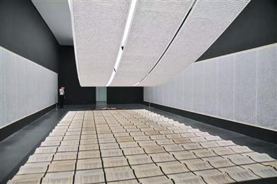 《天書》是一套藝術(shù)裝置,它由上百冊古書、懸掛的古代經(jīng)卷式卷軸和兩側(cè)墻壁上放大的書頁構(gòu)成,書頁和卷軸上印著4000多個徐冰制造的“偽漢字”。這些文字沒有任何意義,就連徐冰自己也無法釋讀。