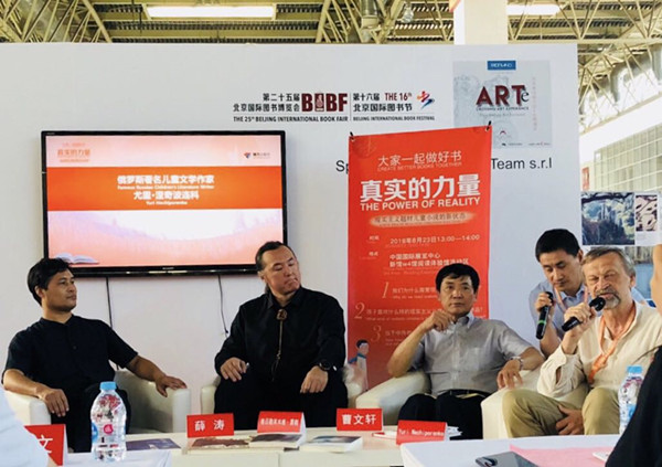 中國兒童文學(xué)作家曹文軒、薛濤、格日勒其木格?黑鶴、王璐琪,來自俄羅斯的翻譯家瑪莉婭?謝梅紐珂、插畫師葉甫根尼?波德科爾津、兒童文學(xué)作家尤里?涅奇波連科和弗拉基米爾?濟斯曼,中國文字著作權(quán)協(xié)會副總干事羅向京等參加了此次對談。活動由接力出版社總編輯白冰主持。