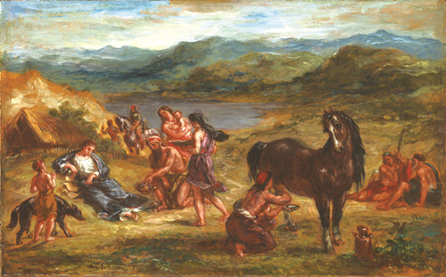 不過,德拉克瓦并不那么贊同庫爾貝反映社會現(xiàn)實的“活力藝術(shù)”觀,而更醉心于歷史傳說??履贰た柌紡娬{(diào):“德拉克瓦早在馬賽爾·普魯斯特之前,就在他的《日記》中表達了一種奇特的思想,即‘回憶與創(chuàng)作的平衡機理’,按照每一個體固有之模式,通過無意識記憶來實現(xiàn)視覺、味覺和感覺必要的融合。在他看來,憑回憶作畫乃是連接所有繪圖成分,保持整體和諧最可靠的方式。將現(xiàn)實的因素與其他文學(xué),或更久遠的創(chuàng)造果實相配合,定能保持其藝術(shù)特性?!笨履贰た柌加终f,德拉克瓦受時代感應(yīng),在《奧維德隱居斯基泰人部落》一畫中繪出了藍霧繚繞的山崗和密遐的遠方,仿佛進入勝境,寄托藝術(shù)家的奇異思索。德拉克瓦畫古羅馬詩人、《變形記》作者奧維德立在一匹紫騮雌馬旁邊深思,好似自己晚年仍在考量中探求“回憶機理”的畫面。