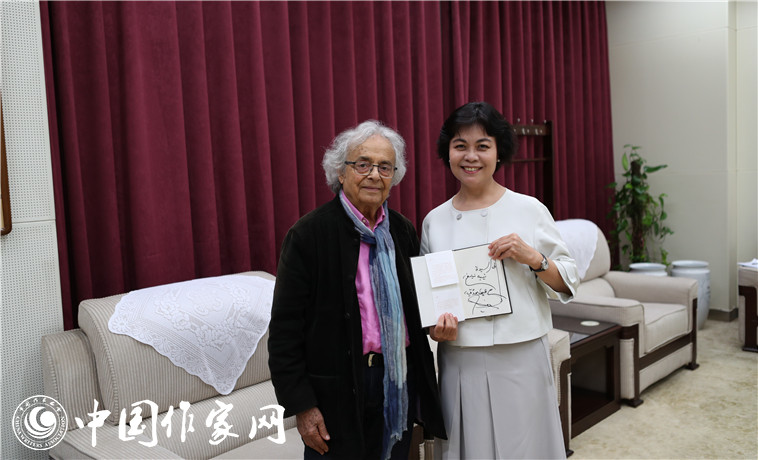 參加國際寫作計(jì)劃的敘利亞詩人阿多尼斯向中國作協(xié)主席鐵凝贈(zèng)送了自己的詩集