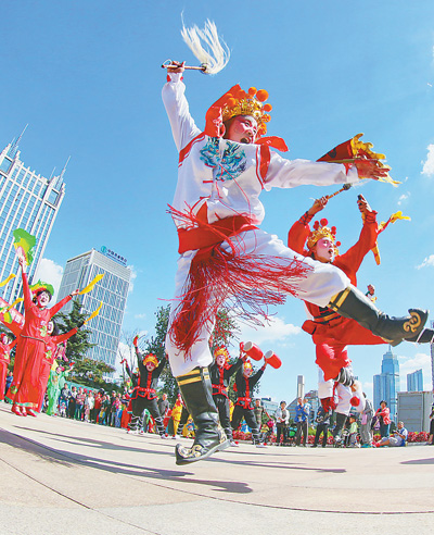 圖為民間藝人表演國(guó)家級(jí)非物質(zhì)文化遺產(chǎn)“海陽(yáng)大秧歌”。