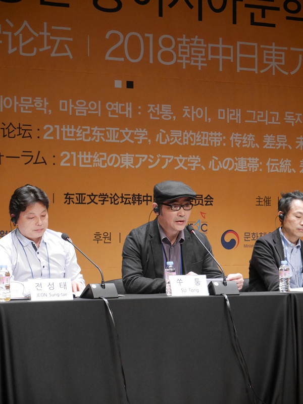 17日下午,中國作家蘇童,韓國作家全成太、金愛爛,日本作家阿部公彥、若松英輔圍繞“傳統(tǒng)”這一話題發(fā)表了各自的看法;中國作家張煒、曹有云,韓國作家陳恩英、張康明以及日本作家島田雅彥、小山田浩子等就則“差異”展開交流。