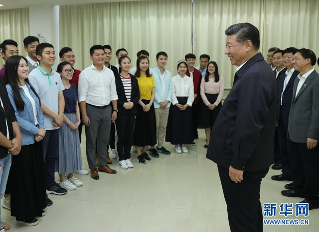 10月22日至25日,中共中央總書記、國家主席、中央軍委主席習(xí)近平在廣東考察。這是10月24日下午,習(xí)近平在廣州考察暨南大學(xué)時(shí)同部分港澳臺(tái)同胞和海外僑胞學(xué)生交流。 新華社記者鞠鵬攝