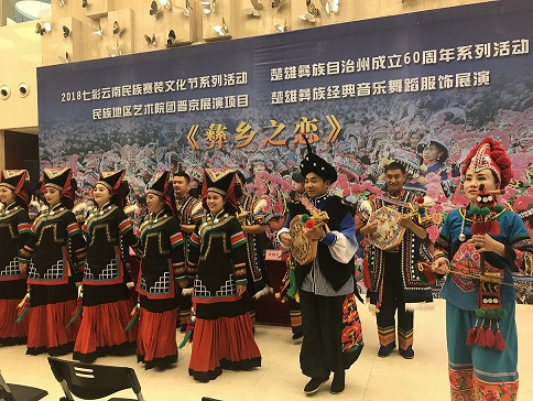 為紀(jì)念改革開放40周年和楚雄彝族自治州建州60華誕,中央民族歌舞團在4月初走進彝鄉(xiāng)10縣市送上精彩的祝福演出,楚雄州更精心籌劃排演了集彝族傳統(tǒng)服飾和本土民歌民舞民樂之大成的彝族經(jīng)典音樂舞蹈服飾展演——《彝鄉(xiāng)之戀》,并有幸成為全國民族地區(qū)藝術(shù)院團晉京展演優(yōu)秀項目之一,這也是“楚雄彝族自治州建州60周年北京成就展系列活動”的收官之作。