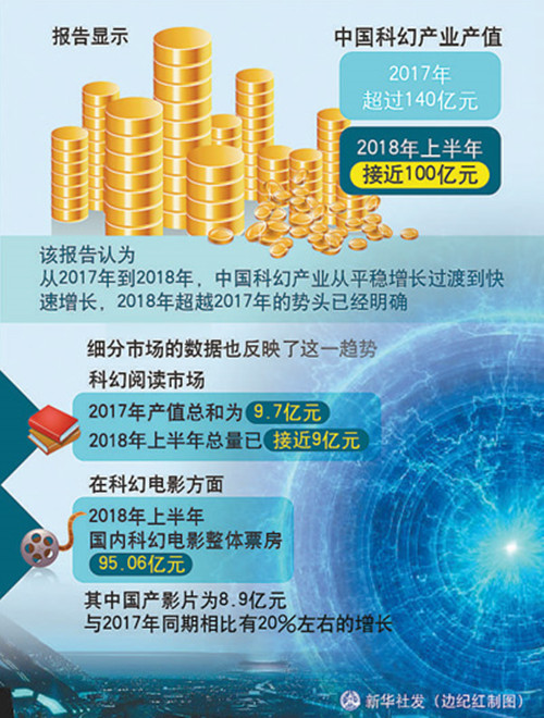 會上,南方科技大學(xué)發(fā)布了《2018中國科幻產(chǎn)業(yè)報告》(以下簡稱報告)。報告顯示,2017年我國科幻產(chǎn)業(yè)整體產(chǎn)值超過140億元。報告認(rèn)為,今年中國科幻產(chǎn)業(yè)的發(fā)展勢頭將超越2017年,細分市場的數(shù)據(jù)反映出這一趨勢。比如,2018年上半年科幻產(chǎn)業(yè)產(chǎn)值已經(jīng)接近100億元。其中,紙質(zhì)書刊的銷售增長較快,圖書整體碼洋7.2億元。