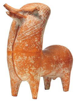 展覽現(xiàn)場不難發(fā)現(xiàn)很多牛的形象,其中閆志特別介紹了一件伊朗出土的牛形陶器,“這件陶器看起來很‘萌’ ,而且造型帶有強烈的現(xiàn)代感,但它的年代實際上是在公元前1200至800年左右,距今已經(jīng)有3000年的歷史了。 ”展覽第二部分的展柜里擺放了大大小小不同造型的牛,都是在西亞、伊朗地區(qū)出土的,而在展覽第一部分的藏品中也能發(fā)現(xiàn)很多牛的形象,比如陶器上牛的紋飾、牛形酒壺等。閆志介紹,瘤牛在古代的西亞、印度、非洲等地區(qū)被視為家畜來飼養(yǎng)繁育,而以公牛崇拜為核心的宗教則發(fā)源于西亞,并向四周傳播?!芭T谌祟愒缙谖拿髦械淖饔镁薮?,對牛神的崇拜也遍及絲綢之路沿線地區(qū)。因此在展現(xiàn)中我們可以看到許多牛的形象,從希臘到兩河流域到伊朗甚至到印度北部。我們把這些牛擺在一起,讓大家看到不同時代、不同地域,人們對牛的崇拜是多么的相似,這也是我們在策展當(dāng)中的一個思考。 ”