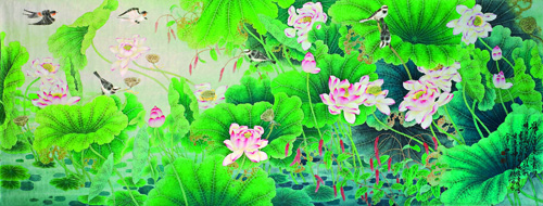 然而,今觀乎《接天蓮葉無窮碧》者,其表現(xiàn)之佳趣,或可近此。挹得天趣,蘊無限的生機,爛爛漫漫,鋪展開去,一路的悠遠、浩蕩,讓人心靜如水。這是對高遠精神的禮贊。
