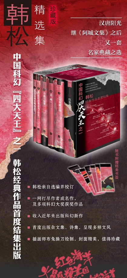 《韓松精選集》是韓松首次將經(jīng)典作品結(jié)集出版,由作者本人親自選編,包括2部經(jīng)典科幻長篇,2部中短篇小說集,1本雜文集,1本詩集,收錄成名作、獲獎作和未出版新作,集中展示了韓松的科幻創(chuàng)作成果。封面由知名插畫師Butu繪制,大面積黑紅色交織,先鋒感十足。