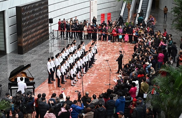 橄欖廳銅門前的合唱是每年開放日的開場節(jié)目,在過去10年間,這一環(huán)節(jié)都是由國家大劇院合唱團(tuán)完成的。而本次,一群活潑可愛的孩子接過了藝術(shù)的“接力棒”,以溫暖澄澈的童聲合唱《群星閃爍》《歌聲與微笑》等,拉開全天活動(dòng)的序幕。