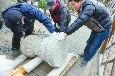 昨天,市總工會(huì)將機(jī)關(guān)院內(nèi)發(fā)現(xiàn)的清代露陳墩等8件石刻文物捐贈(zèng)給圓明園收藏。 本報(bào)記者 吳鏑攝