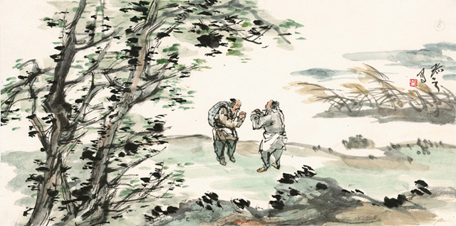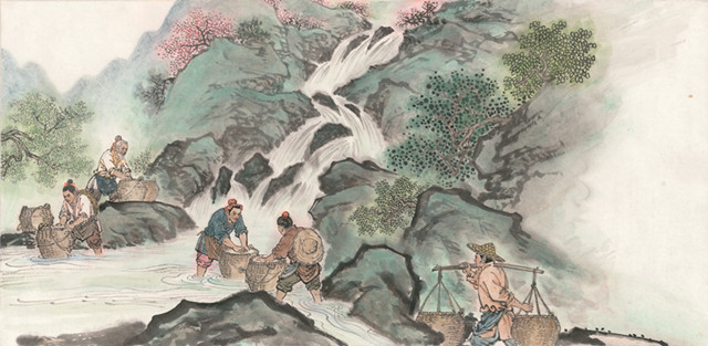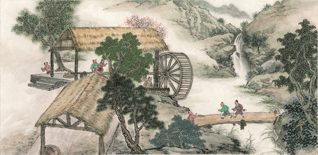 繪畫的表現(xiàn)是繪本極其重要的一面。這套繪本采用水墨畫的形式,將傳統(tǒng)工匠的故事娓娓道來,從內(nèi)容到形式,達(dá)到了完美的統(tǒng)一。《瓷》《紙》《茶》由盛元富老先生繪制。盛老先生是著名的中國畫、插畫、連環(huán)畫家。老先生以繪畫為樂,雖經(jīng)古稀之年,仍然精神健朗,且筆墨不輟。老先生不幕名利,爽快地答應(yīng)為這套兒童繪本創(chuàng)作插畫,意在為孩子做一點(diǎn)有意義的事??催@三本繪本的創(chuàng)作,老練持重的筆墨揮灑自如,水墨氤氳間可見宋人山水、生活場景的描繪揮一氣呵成。設(shè)色清新拙樸,濃淡相宜。《扇》由青年女畫家吳珍之女士創(chuàng)作。這是她第一次創(chuàng)作兒童繪本,因?yàn)橄矚g這個題材,所以欣然接受了繪本的創(chuàng)作。她的的筆墨新穎活潑而又酣暢淋漓、揮灑自如。擅變的水墨流轉(zhuǎn)中,時而淡雅,時而濃郁的色彩如流光溢彩般閃爍。兩位畫家的繪畫起于心,重于情,得乎趣,單純而又真摯,達(dá)到了中國畫意境、氣韻、格調(diào)的境界,賦予平凡的工匠故事以藝術(shù)的審美價值。