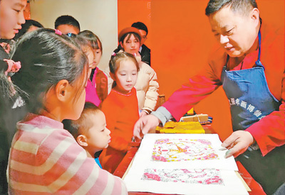 1月31日,國(guó)家圖書館舉辦的“年年有馀——國(guó)家圖書館暨武強(qiáng)年畫博物館藏年畫專題展”開展。展覽上,非遺傳承人向孩子們現(xiàn)場(chǎng)演示年畫制作,講解年畫中蘊(yùn)含的傳統(tǒng)文化。 本報(bào)記者 王 玨攝