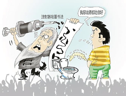 比如“射書”,即用灌滿墨汁的針管在宣紙上射出道道墨跡(視頻顯示,宣紙由幾位美女手提橫展,書者邁著太極步,突然作一溜煙小步奔跑狀,同時用幾支針管射出墨汁);“吼書”,顧名思義就是邊吼叫邊書寫,書者十分亢奮,類似耍酒瘋。只是,書寫地點恐怕要找個僻靜無人之地,否則一定 “擾民”;“鼻書”,即在鼻孔里插兩支毛筆俯紙而書,容易引人產(chǎn)生不太衛(wèi)生的聯(lián)想;“左右開弓或手腳并用多管齊下書”(無須解釋了);“雙人倒抱美女垂發(fā)蘸墨書”,只見倒懸的美女滿臉墨汁,花容失色,一頭烏發(fā)成了掃地的拖把。還有什么 “刀書”“溺水書”“盲書”“塑料瓶蓋穿孔書”“洗車噴頭書”等等,簡直古靈精怪,無奇不有。更有甚者,還走出了國門,在威尼斯眾目睽睽之下表演 “女下體書”,且使用書法很忌諱的大紅墨。