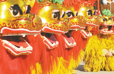 舞獅,也稱“耍獅子”“獅燈”,一般由兩人蒙上布藝獅皮進行表演,在各地春節(jié)年俗表演中長盛不衰。