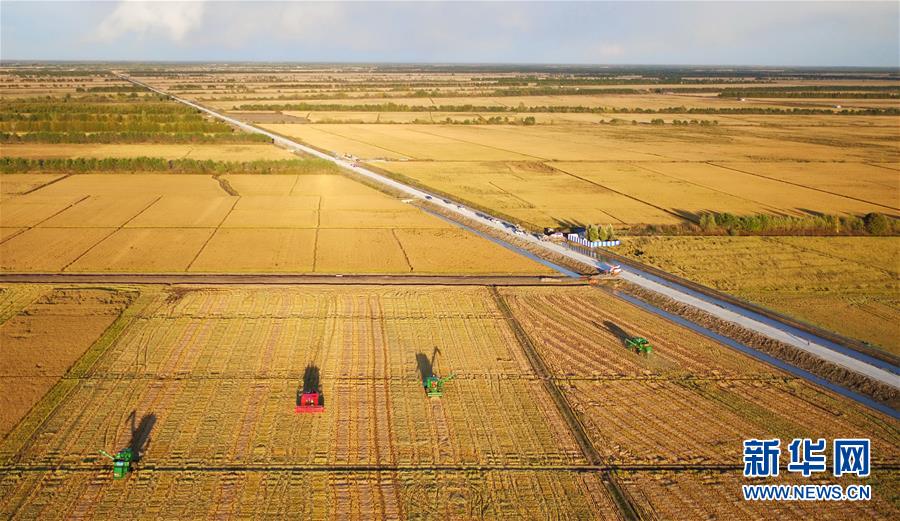 這是大型農(nóng)機在黑龍江省三江平原一處稻田收割水稻(2017年9月28日無人機拍攝)。 新華社記者 王建威 攝