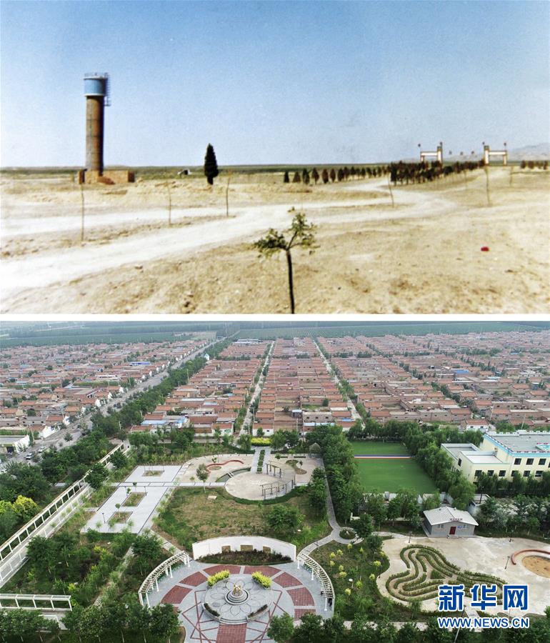 拼版照片:上圖為寧夏銀川市永寧縣閩寧鎮(zhèn)建設初期的資料照片;下圖為2018年8月17日無人機拍攝的寧夏銀川市永寧縣閩寧鎮(zhèn)原隆村(新華社記者王鵬攝)。受益于福建、寧夏多層次、多形式、寬領域、全方位的扶貧協(xié)作,閩寧鎮(zhèn)這片曾經(jīng)的戈壁荒灘,被建設成現(xiàn)代化的生態(tài)移民示范鎮(zhèn)。新華社發(fā)