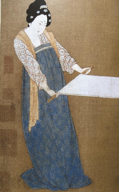 張萱和周昉是唐代仕女畫最重要的代表人物?!缎彤嬜V》稱張萱“于貴公子與閨房之秀最工”,善于描繪曲眉豐頰、“朱暈耳根”的仕女形象。張萱的原作今已無存,史上留下兩件重要的摹本,即傳說是宋徽宗臨摹的《虢國夫人游春圖》卷和《搗練圖》卷。其中《搗練圖》卷現(xiàn)藏于美國波士頓美術博物館,表現(xiàn)的是貴族婦女搗練縫衣的工作場面,按勞動工序分成搗練、織線、熨燙三組。只見宮女們身著低領窄袖短襦,系高腰長裙并扎絲帶,身披輕薄如紗的印繡紋樣披帛,舉止嫻雅,意態(tài)從容。