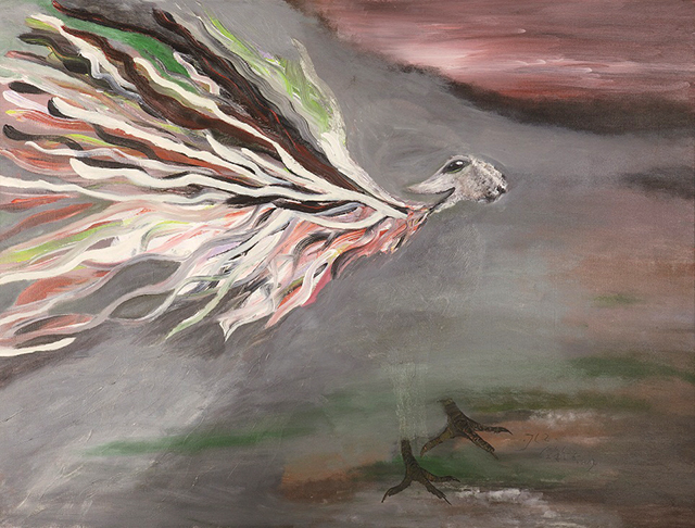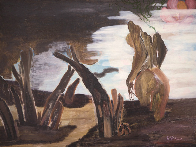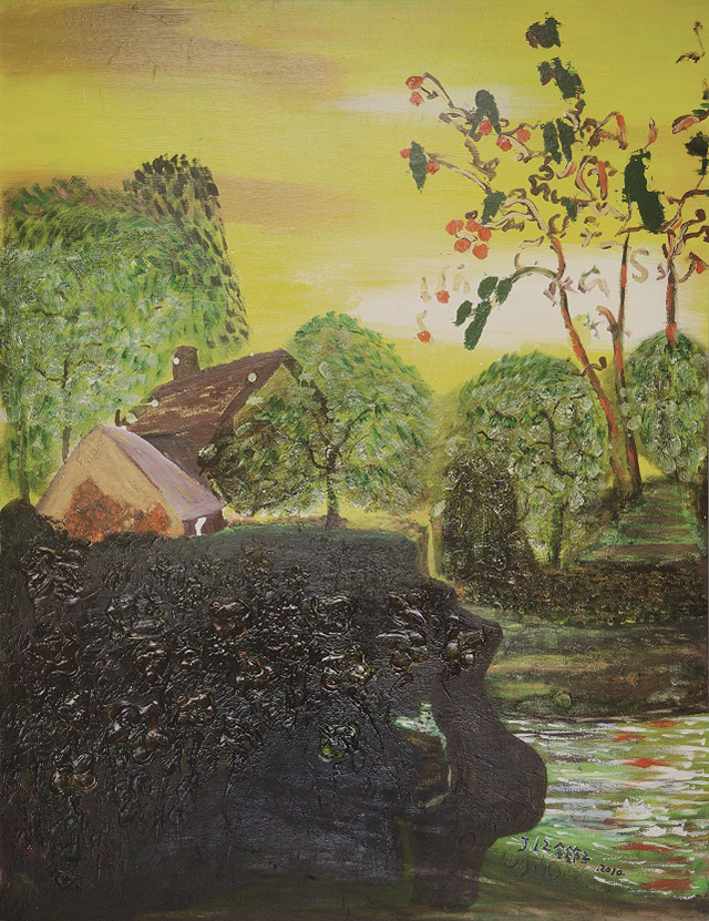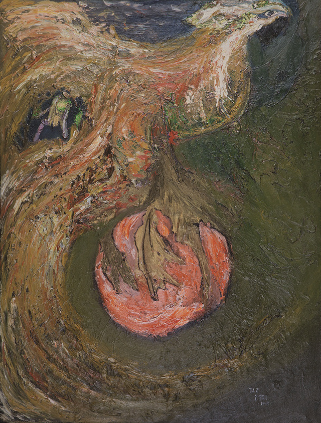 曾來德、商震等談到,詩人充滿了奇思妙想,當她把這些奇思妙想用繪畫的方式呈現(xiàn)出來,其作品一定與其他畫家的不一樣。金鈴子的畫在技術(shù)上也許不是十分完善,但其中所體現(xiàn)出來的詩意性、隨機性、想象力、靈性,卻是令人驚喜的。有時候,藝術(shù)創(chuàng)作講究“新、奇、險、絕”,金鈴子在這些方面是有所追求的。她是用思想在作畫,通過色彩反映出一位女詩人的內(nèi)心獨白。她拋棄了原理和規(guī)則,大膽構(gòu)圖、用色。這些颶風般的筆觸,與其說來自她得天獨厚的直覺,不如說得自她對理性或規(guī)矩的傲視。我們會驚訝于她對色彩及油畫筆觸的敏感控制,更驚訝于她借色彩及捉摸不定的筆觸組合所重構(gòu)的幻象空間。
