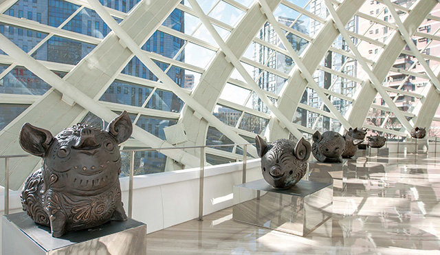 在此次的參展作品中,觀眾既可以看到韓美林在2015年為紀(jì)念世界反法西斯戰(zhàn)爭(zhēng)勝利70周年、聯(lián)合國(guó)成立70周年而特意創(chuàng)作的《和平守望》,也能欣賞到其曾于2008年被大英博物館收藏的青銅雕塑《馬》,還能欣賞到表現(xiàn)人文主義關(guān)懷的《母與子》系列、《豬》《熊貓》《熊》《馬》《牛》等動(dòng)物系列,以及頗具實(shí)驗(yàn)性的《人體》《天書(shū)》等十余個(gè)系列。其中,韓美林創(chuàng)作的形態(tài)各異、憨態(tài)可掬的小豬雕塑,曾于今年春節(jié)前后在故宮博物院舉辦的“韓美林生肖藝術(shù)大展”中亮相,吸引了海內(nèi)外大量觀眾前來(lái)參觀。