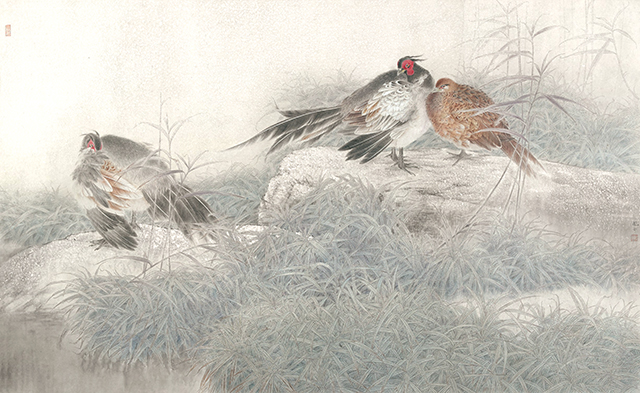 “蟬噪林逾靜,鳥(niǎo)鳴山更幽”,陳鳳壬自然深知,他的工筆花鳥(niǎo)往往會(huì)在大片大片的靜物中添入一兩只鳥(niǎo),一只蝸?;蛘咭粌芍或唑?,它們的出現(xiàn)似乎并不是主體性的,而是背景性的——在陳鳳壬的繪畫(huà)中恬靜、淡然和超拔才是主體,它散發(fā)出的、混合著強(qiáng)烈美感的氣息才是主體,這鳥(niǎo)、這魚(yú)、這蟲(chóng)的出現(xiàn)往往是“逾”是“更”,更強(qiáng)化了氣息的存在?!逗商燎锷?,一只翠鳥(niǎo)居于畫(huà)幅的核心,它站立于一枚枯萎的蓮蓬的梗上:陳鳳壬賦予它肌體和活力,但在畫(huà)中更有活力更為闊大的卻是安靜,靜謐?!稓q月悠然》,大片的竹林、怪石和一只白色的水鳥(niǎo)共在此畫(huà)幅之中,你似乎能聽(tīng)得到風(fēng)吹竹葉的細(xì)響,似乎能聽(tīng)到偶爾的一兩聲?shū)B(niǎo)鳴——恰恰是因?yàn)槿绱?,整個(gè)畫(huà)面給人的卻是極為強(qiáng)烈的靜謐氣息,它讓你走近這幅畫(huà)的時(shí)候“不得不”壓制住呼吸,你甚至怕“肆無(wú)忌憚”的呼吸會(huì)驚擾到那只鳥(niǎo),會(huì)驚擾到那種安靜。更為精妙的《往事隨風(fēng)》,他畫(huà)下的是一只將要飛出畫(huà)幅的飛鳥(niǎo),他寫(xiě)下的是動(dòng)態(tài),可你還是能夠感覺(jué)到靜,感覺(jué)到“靜氣”的豐盈?!办o氣”一直是中國(guó)工筆花鳥(niǎo)的一個(gè)極致追求,它也被諸多的人和諸多的畫(huà)家掛在嘴上,但實(shí)際上能將工筆花鳥(niǎo)畫(huà)得出安靜之美來(lái)的并不多。在陳鳳壬的繪畫(huà)作品中,無(wú)論是大尺幅、有著渾闊感的大制作,還是繪于小幅卡紙上的一鳥(niǎo)、一蟲(chóng)、一花的一隅小景,那種靜氣都是統(tǒng)一地在著,充溢于畫(huà)幅之間。陳鳳壬擅用淡墨,淡彩,即使在經(jīng)歷數(shù)十次的渲染之后它依然呈現(xiàn)出那種淡然;陳鳳壬善于使用“灰”色調(diào),他不讓任何一種顏色太跳太過(guò)絢麗,強(qiáng)化著色覺(jué)上的統(tǒng)一性——這當(dāng)然是讓“靜氣”呈現(xiàn)于畫(huà)幅的技術(shù)保障,但它并不是核心的。在我看來(lái)核心的是他的心性。那種恬靜、淡然、超拔更多地出自于他的血液,他只是在繪畫(huà)的時(shí)候?qū)⑺鼈兒魡境鰜?lái)而已。就像弘一晚年的書(shū)法,它并不是技巧使然而是心性使然,當(dāng)然技巧從來(lái)都是“使然”的最有力支撐。