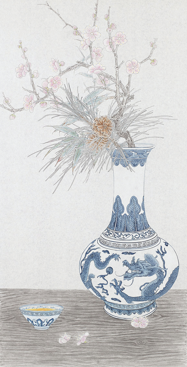 在陳鳳壬的工筆繪畫(huà)系統(tǒng)中還有另外一個(gè)類型,以《歲歲年年》《待知音》為代表。它所畫(huà)下的多是文玩、花瓶和“清供”,頗有現(xiàn)代感和裝飾意味,精細(xì)典雅,悅目清心;同時(shí)他還嘗試在宣紙上繪畫(huà)石窟里的佛像雕塑,試圖在平面上展現(xiàn)石像的重量和層面感,展現(xiàn)漫長(zhǎng)歲月的斑駁留痕……他一直在變,在嘗試,讓自己能夠更廣闊些,然而一直未變的是他對(duì)藝術(shù)的精益求精,以及對(duì)那種恬靜、淡然、超拔氣息的捕捉和把握。再?gòu)?qiáng)調(diào)一次,這種氣息來(lái)自于他的內(nèi)心,已經(jīng)和他完整地融為了一體。他內(nèi)心的安靜實(shí)在讓人敬重。
