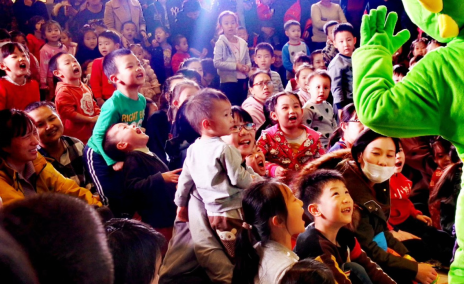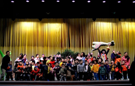上圖/某校園演出結(jié)束孩子們和演員興奮合影