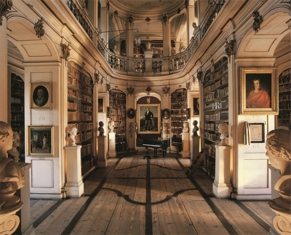 公爵的圖書館早已存在,當(dāng)然,它雖然始于16世紀(jì)的魏瑪,但直到1691年才正式落成揭幕。圖書館館藏已有很好的基礎(chǔ),但對文學(xué)擁有獨(dú)到品味的公爵夫人深知其不足。項(xiàng)目采用了最初的設(shè)計(jì),很快便付諸實(shí)施了。建筑的中心被打開,創(chuàng)造了一個可供閱覽和保存圖書的巨大中央空間,上面是一個擺滿書架的相當(dāng)大的廊臺。在大廳和城堡外墻之間,寬闊的走廊環(huán)繞著大廳,走廊兩邊都擺放有書架。圖書館的洛可可晚期風(fēng)格裝飾嚴(yán)肅、簡單、迷人,而且實(shí)用。深色板條的鑲木地板看上去就像是鋪著地毯一樣。這里到處都是繪畫、裝裱的畫作和造訪此處的名人的白色大理石半身像,在整個歐洲早已聲名遠(yuǎn)揚(yáng)。迥異于那些多如牛毛的巴洛克修道院,這里是專門為愛書人創(chuàng)設(shè)的地方。