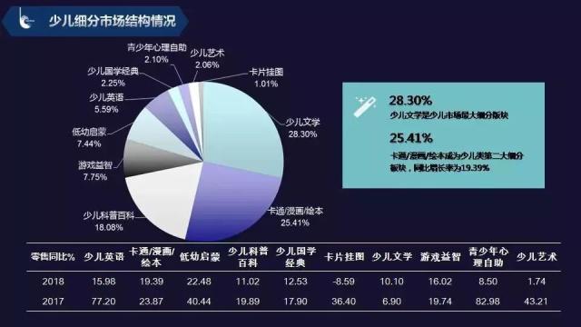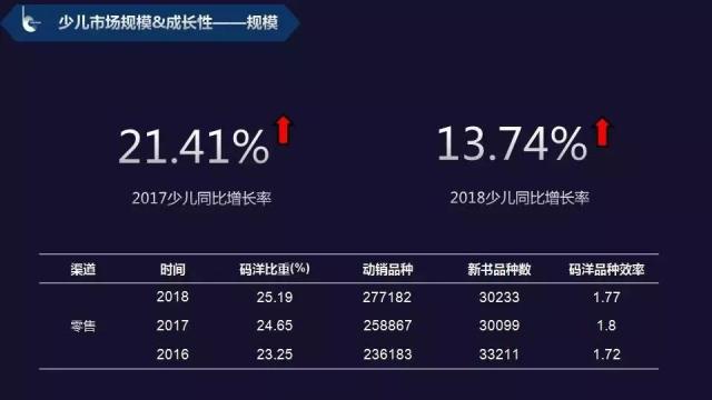 在剛剛過去的2018年,少兒出版市場(chǎng)同樣享受了豐收的喜悅:少兒市場(chǎng)的同比增長(zhǎng)為13.74%,雖然較2017年21.41%的增長(zhǎng)速度放緩,但少兒市場(chǎng)依然是圖書市場(chǎng)占比最大的細(xì)分類且碼洋比重較去年有所上升,2018年碼洋比重增長(zhǎng)到25.19%。尤其是在網(wǎng)絡(luò)端,少兒圖書在網(wǎng)店渠道的銷售增速高達(dá)26.56%,碼洋占比達(dá)27.15%。