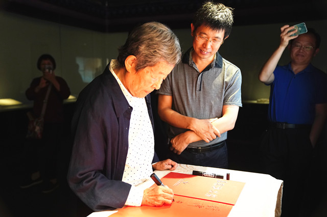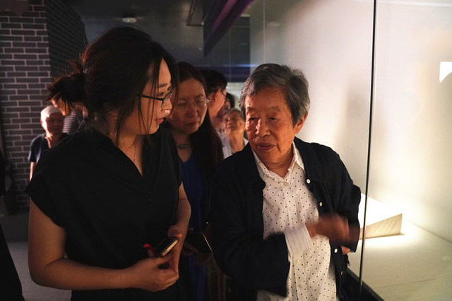 舒濟(右)參觀展覽,中國現(xiàn)代文學(xué)館征集編目部王雪博士(左)進行講解