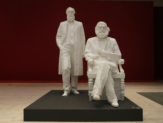 一樓大廳最引人注目的是卡爾?馬克思的青銅雕像,馬克思是全世界無產(chǎn)階級和勞動人民的革命導(dǎo)師,無產(chǎn)階級的精神領(lǐng)袖。這尊雕像于2018年5月5日在馬克思的家鄉(xiāng)德國特里爾市落成,特里爾市市長萊博說:“馬克思雕像重新變得栩栩如生,他的思想理念得以在21世紀以視覺文化的方式呈現(xiàn)出來?!?/p>