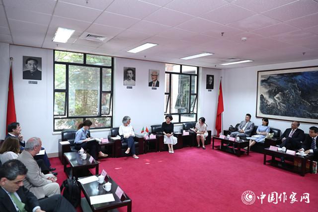 論壇開幕前,中國作家協(xié)會主席鐵凝與葡萄牙文化部長豐塞卡親切會談,中葡兩國作家代表參加會談