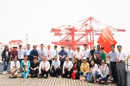 采訪團(tuán)在洋山港智能集裝箱碼頭合影