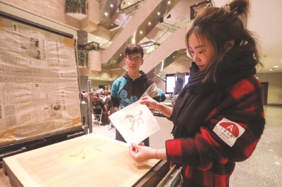 “丹青寶筏”2019上博奇妙夜活動(dòng)上,觀眾在展示自己制作的書(shū)畫(huà)復(fù)制品。本報(bào)記者葉辰亮攝