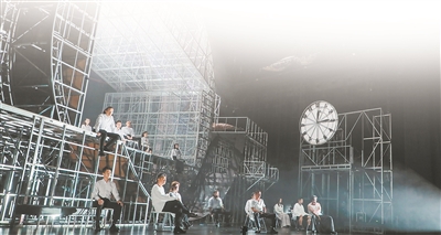 “在舞臺(tái)上,你們會(huì)看見巨大的一個(gè)環(huán)形裝置。實(shí)際上,這部劇的整個(gè)時(shí)間表達(dá)也是環(huán)形的?!眳涡浇庾x了舞臺(tái)裝置的象征意味:在這樣一個(gè)環(huán)形的一天天重復(fù)的偶然的世界里面,我們才會(huì)真正地發(fā)現(xiàn)人類的悲劇。
