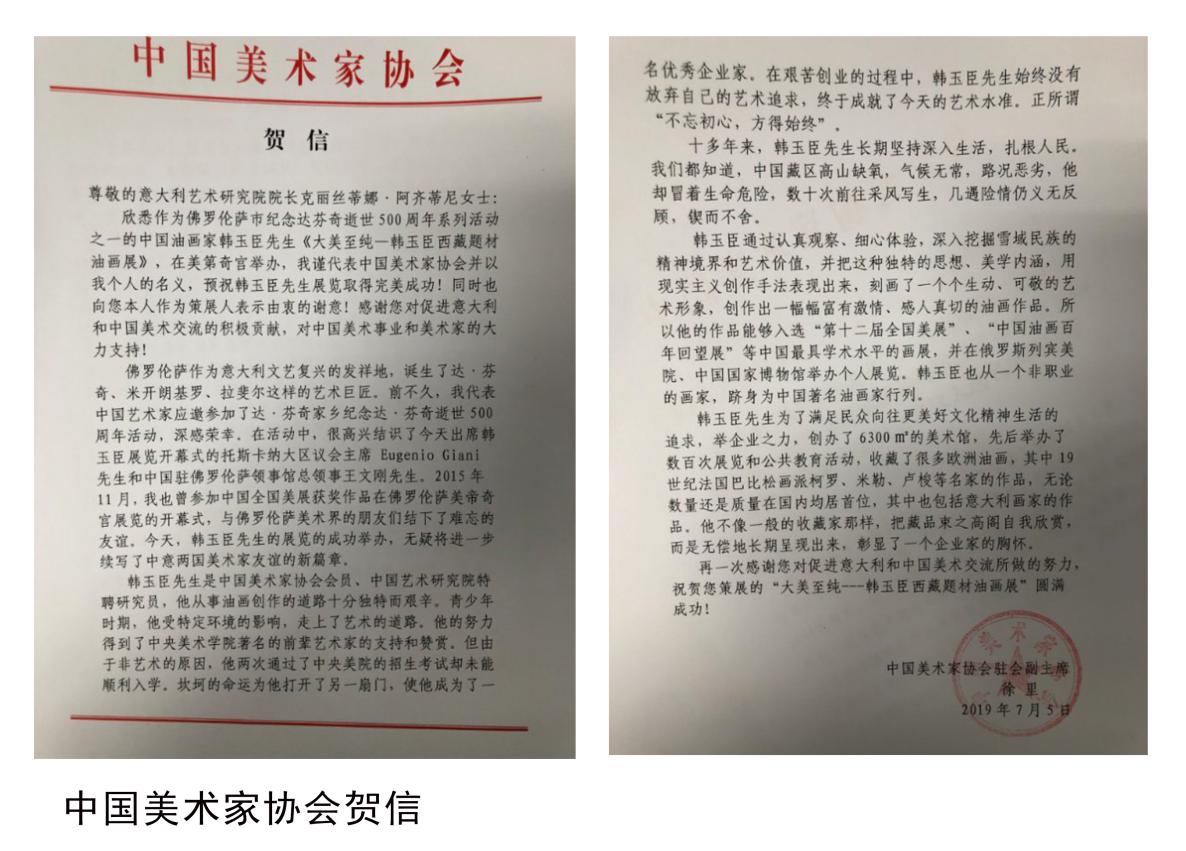 徐里在賀信中說:“佛羅倫薩作為意大利文藝復(fù)興的發(fā)祥地,誕生了達(dá)?芬奇這樣的藝術(shù)巨匠。今天,韓玉臣先生的展覽無疑將進(jìn)一步加深中意美術(shù)界之間的友誼。韓玉臣先生是中國美協(xié)會員、中國美協(xié)油畫藝委會名譽(yù)委員,他從事油畫創(chuàng)作的道路十分獨(dú)特而艱辛。他對藝術(shù)的熱情萌生于青少年期間,但由于非藝術(shù)的原因,兩次通過了中央美院的招生考試卻未能順利入學(xué)??部赖拿\(yùn)為他打開了另一扇門,使他成為了一名優(yōu)秀企業(yè)家。在艱苦創(chuàng)業(yè)的過程中,韓玉臣先生始終沒有放棄自己的藝術(shù)追求,10多年來,堅(jiān)持深入生活,數(shù)十次到藏族地區(qū),遇到過好多次險情,然而他始終鍥而不舍、義無反顧。他通過認(rèn)真觀察體驗(yàn)、深入挖掘雪域民族的藝術(shù)價值、高原使命,把這種獨(dú)特的思想、美學(xué)內(nèi)涵,用現(xiàn)實(shí)主義表現(xiàn)形式表現(xiàn)出來。所以他的作品能夠入選“第十二屆全國美展”、“中國油畫百年回望展”等最具學(xué)術(shù)水平的畫展。韓玉臣從一個非職業(yè)的畫家,躋身為中國著名油畫家行列。”
