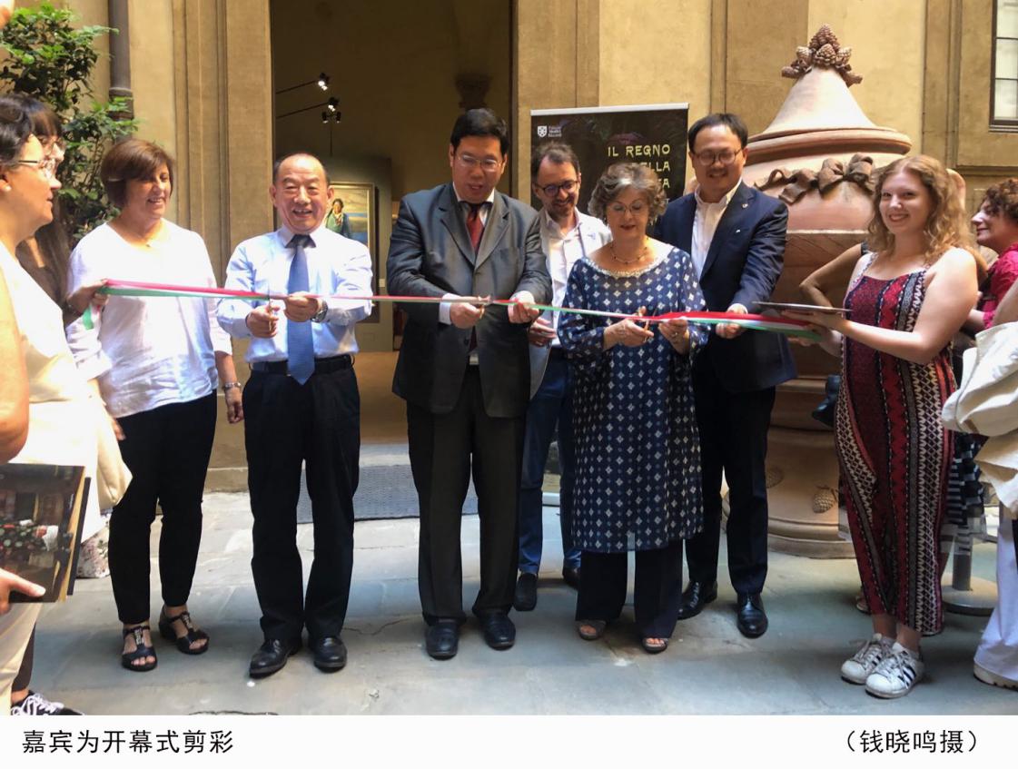 在參加開幕式嘉賓的熱烈掌聲和期盼中,中國駐意大利佛羅倫薩領(lǐng)事館總領(lǐng)事王文剛、意大利藝術(shù)研究院院長克麗絲蒂娜?阿齊蒂尼和畫家韓玉臣為展覽剪彩。
