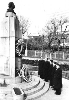 1956年,巴金(右一)等在上海向普希金紀念碑獻花