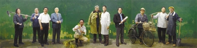 何紅舟、封治國、尹驊油畫《民族脊梁——共和國英?!方M畫之三。畫面上的勞模從左至右依次為:申紀(jì)蘭、史來賀、吳仁寶、魯冠球、袁隆平、鄧稼先、蔣筑英、包起帆、徐虎、楊懷遠(yuǎn)、李雙良。設(shè)計:蔡華偉
