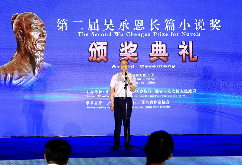 吳義勤在致辭中談到,今年是新中國成立七十周年,也是中國作協(xié)成立七十周年,在大慶之年舉辦這樣的頒獎(jiǎng)活動(dòng),有著特別的意義。吳承恩作為淮安歷史文化名人,在中國文學(xué)史上留下了濃墨重彩的一筆。此次淮安方面主辦、聯(lián)手人民文學(xué)雜志社、江蘇省作協(xié)作為學(xué)術(shù)支持的吳承恩長(zhǎng)篇小說獎(jiǎng),不僅是對(duì)中國傳統(tǒng)文化精神的傳承和致敬,也是推進(jìn)當(dāng)代文學(xué)創(chuàng)作的重要舉措,同時(shí)對(duì)于促進(jìn)基層文化建設(shè)乃至更大層面的文化發(fā)展都有著巨大的推動(dòng)作用。他希望“吳承恩長(zhǎng)篇小說獎(jiǎng)”能夠繼續(xù)積累經(jīng)驗(yàn),形成自己的特點(diǎn),成為中國文學(xué)百花園里的重要獎(jiǎng)項(xiàng),也希望獲獎(jiǎng)作家能夠創(chuàng)作出更多精品力作。