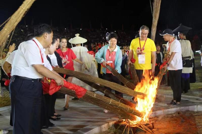 火把節(jié)狂歡活動(dòng)上,西昌市委書(shū)記李俊(右二)和國(guó)內(nèi)外嘉賓共同點(diǎn)燃熊熊的火把。(李春攝)