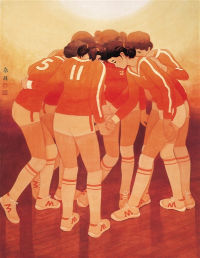 上世紀80年代,中國女排的姑娘們用汗水和拼搏向世人展現(xiàn)了她們“絕不拋棄,決不放棄”的精神。在1984年舉辦的第六屆全國美展上,“女排精神”出現(xiàn)在多個畫種中。徐啟雄中國畫《決戰(zhàn)之前》描繪了女排姑娘上場前圍作一圈擊掌加油的場景,人物造型質(zhì)樸,構(gòu)圖組織別致,溫暖的紅色調(diào)烘托出昂揚向上的氣氛。李慕白與金雪塵合作的年畫《女排奪魁》,則刻畫了一位手捧獎杯和排球、胸前佩戴金牌、站在國旗下的女排姑娘,在鮮花的簇擁中,她綻放出勝利者的微笑。朱達誠雕塑《熱淚》則另辟蹊徑,表現(xiàn)了女排姑娘艱難拿下關(guān)鍵一分后,在場上圍成一圈,蹦跳著、叫喊著,流下熱淚的激動瞬間,作品真實生動、感人至深。美術(shù)工作者們用自己的作品,從不同角度表現(xiàn)、傳遞“女排精神”,突破時空,凝固歷史,為新中國體育題材美術(shù)留下了閃爍著金色光芒的記憶。