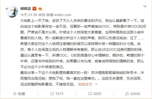 2019年8月17日凌晨,作者蝴蝶藍(lán)針對粉絲認(rèn)為主角葉修OOC的問題做出了回應(yīng)