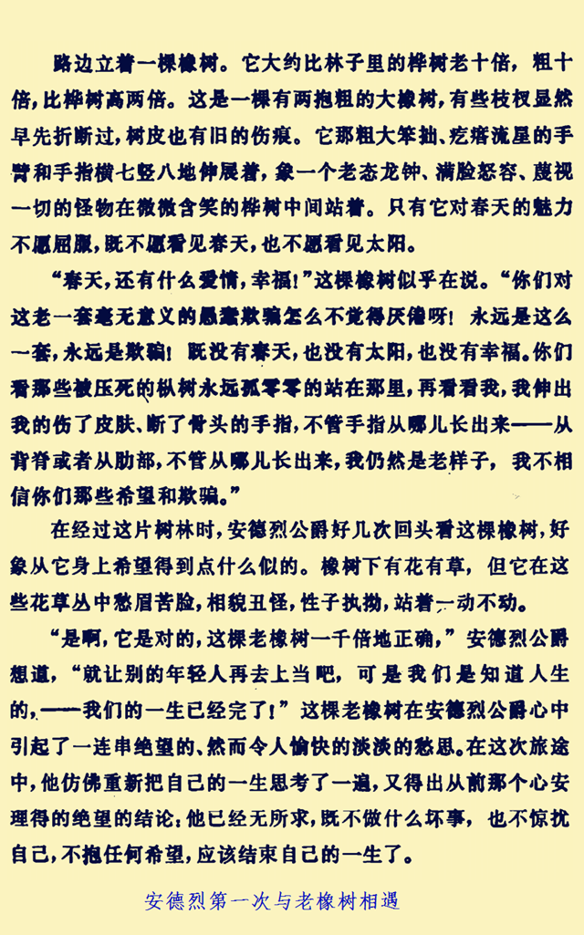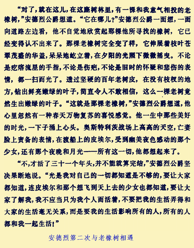 托爾斯泰善于通過描寫心理變化的過程展示人物思想性格的演變,俄羅斯文藝?yán)碚摷臆嚑柲嵫┓蛩够鶎⑦@種藝術(shù)特色命名為“心靈辯證法”?!稇?zhàn)爭與和平》中的著名片段“安德烈與老橡樹的兩次相遇”即運用心靈辯證法的方式寫出了安德烈的內(nèi)心轉(zhuǎn)變。
