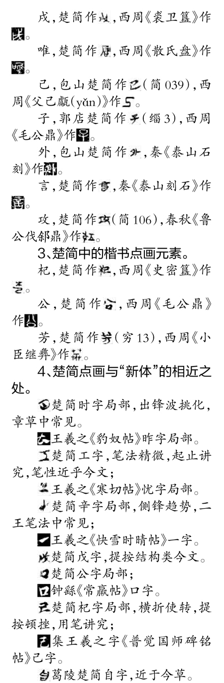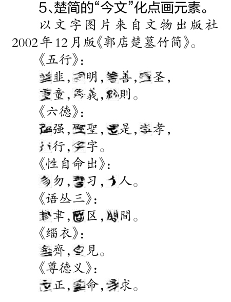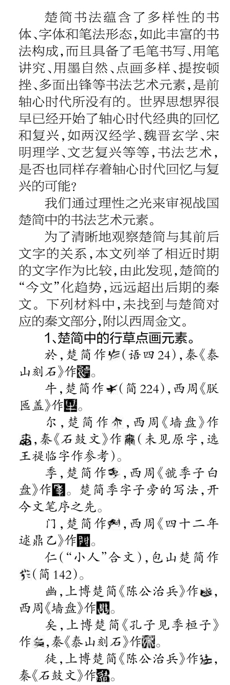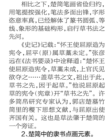 關(guān)于楚簡(jiǎn)文字,郭沫若先生認(rèn)為:“體式簡(jiǎn)略,形態(tài)扁平,接近于后代的隸書(shū)?!濒缅a圭先生也認(rèn)為:“如果秦沒(méi)有統(tǒng)一全國(guó),六國(guó)文字的俗體遲早也會(huì)演變成類(lèi)似隸書(shū)的新字體的?!别堊陬U先生也有相同的觀點(diǎn)。思想經(jīng)典的抄寫(xiě),啟迪了書(shū)寫(xiě)者的自由意志和人性發(fā)微,產(chǎn)生了多樣的筆法、墨法、章法形態(tài),具備了后來(lái)草、隸、行、楷多種字體的筆法和結(jié)構(gòu)。